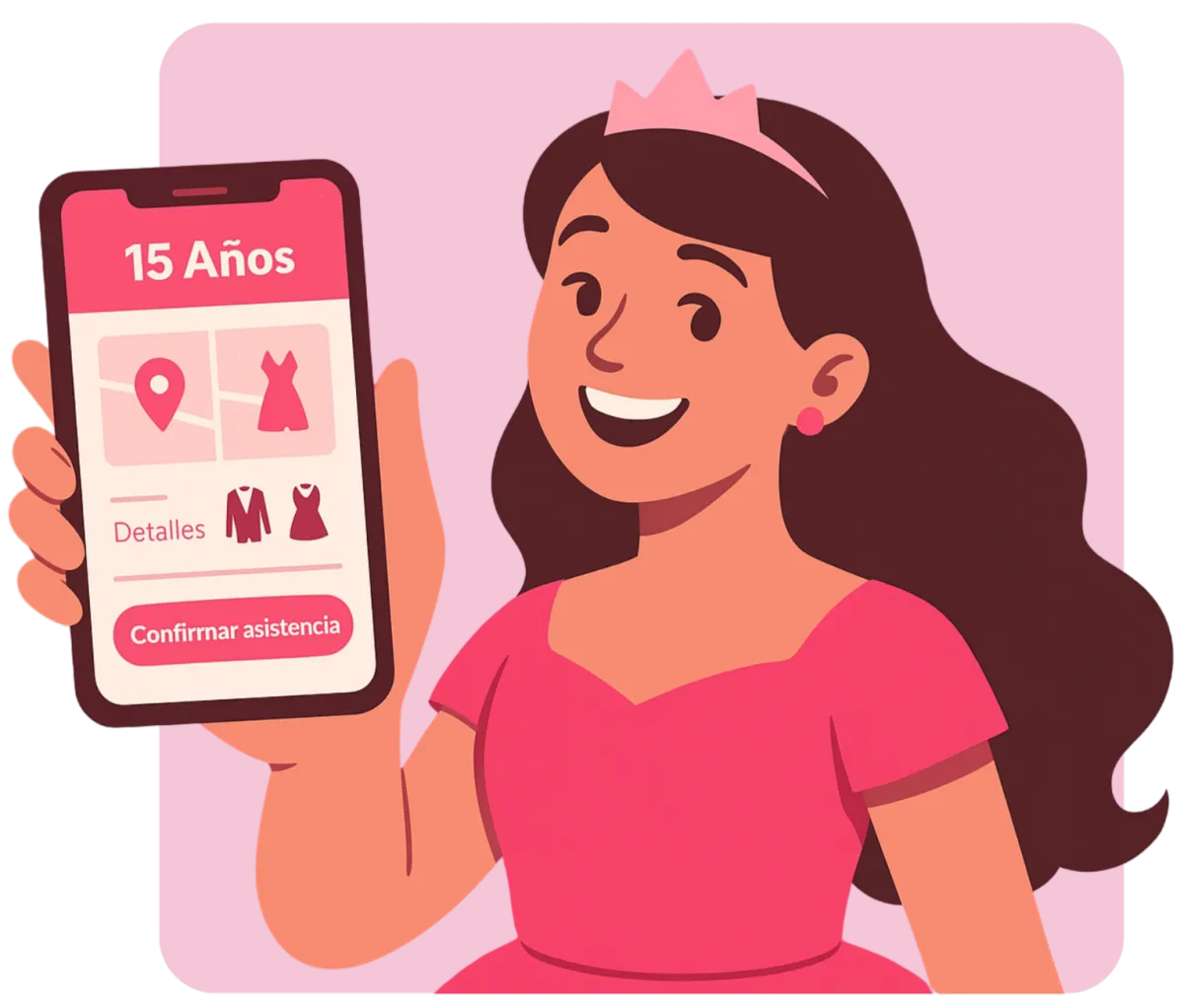 En cada proyecto te acompaño para que tu web de 15 refleje tu estilo y le haga la vida fácil a tus invitados. Sumamos secciones útiles (confirmación de asitencia, mapa, dress code), detalles que encantan y un flujo simple para compartir. El objetivo: que disfrutes el proceso y el gran día sin complicaciones.